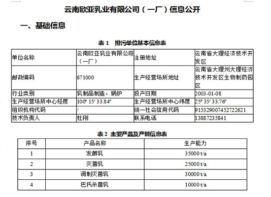 云南歐亞乳業有限公司(一廠)信息公開